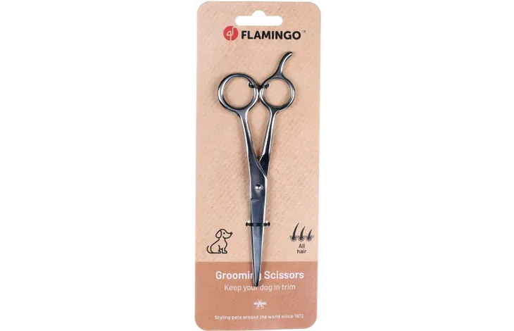 With the Flamingo Trimming Scissors, you can easily trim your dog's hair. These dog grooming scissors are ideal for those tricky areas around the ears, nose, and legs. The rounded blade tips prevent skin injury.